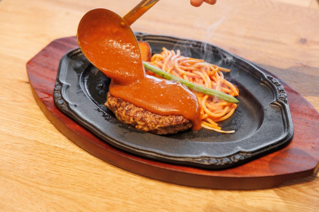 お肉は、その日に店舗で挽肉にするほど鮮度にこだわり、熱々の鉄板でハンバーグを提供し、目の前でソースやチーズをかけて最終調理。